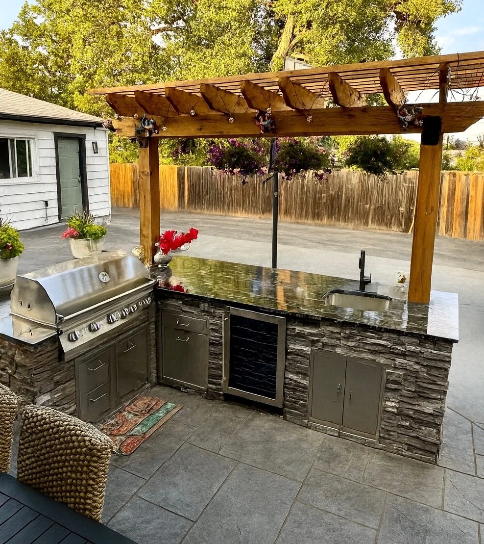 Bring warmth, style, and functionality to your backyard with a custom-designed outdoor kitchen and fire feature.